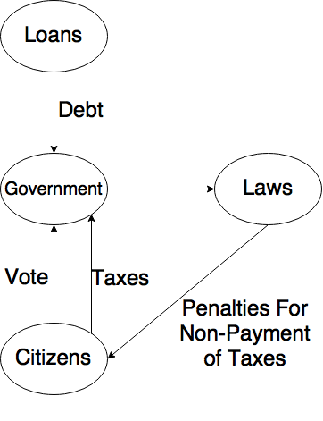 Crowd Funded Government would require no loans in order to operate. However, many governments have existing loans that need to be paid off. The schedule of principal and interest payments due on existing loans would be calculated for the upcoming fiscal year, and then those payments would be deducted from the total collected from that year’s voluntary contributions.
