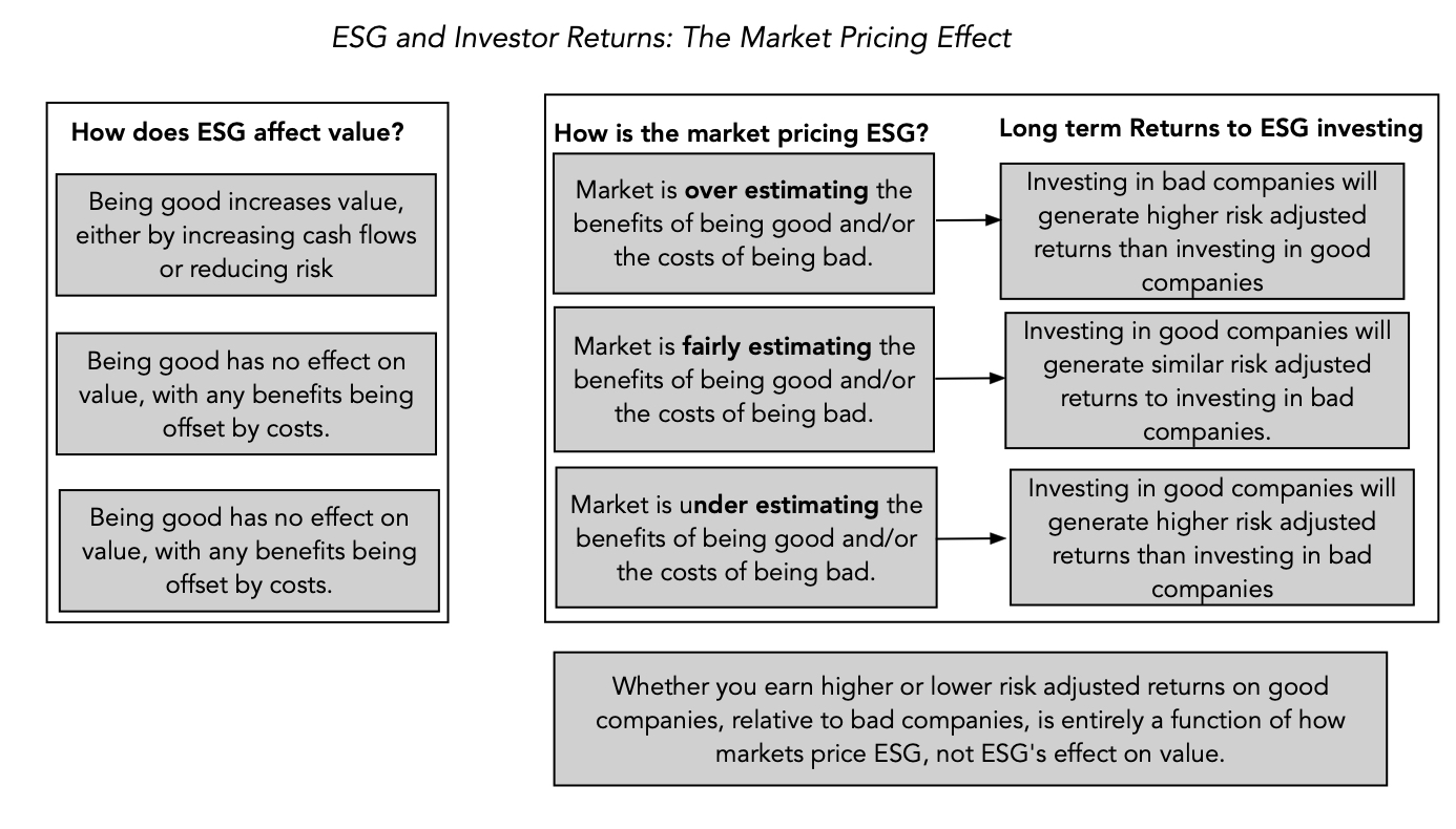 - If the market has fully priced in the ESG effect on value, positive or negative, investing in ‘good’ companies or avoiding ‘bad’ companies will have no effect on excess returns. In fact, if being good makes companies less risky, investors in good companies will earn lower returns than investors in bad companies, before adjusting for risk, and equivalent returns after adjusting for risk.