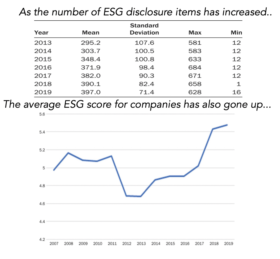 It is entirely possible that big companies are better corporate citizens than smaller ones, but it is also just as plausible that big companies have the resources to play the ESG scoring game, and that more disclosure is a tactic used by these companies that want to bury skeletons in their current or past lives, rather than expose them. In fact, a JP Morgan study of ESG Ratings and disclosures also points to a larger danger from enhanced ESG disclosure requirements, which is that the ESG ratings seems to increase across companies, as disclosure increase.